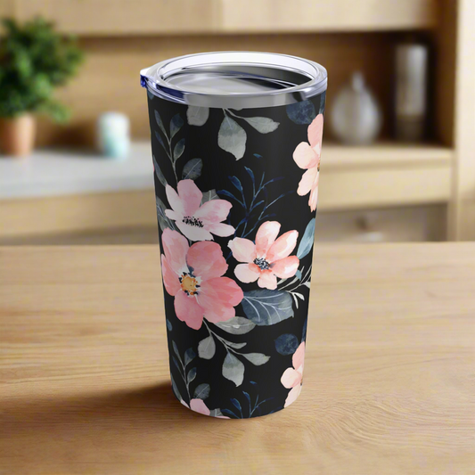 Elegant Floral Tumbler – 20oz Black & Pink Flower Design