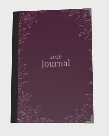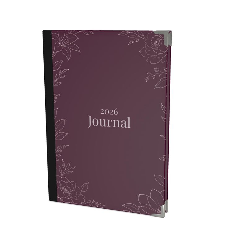 The hardcover is wrapped in Monroe satin fabric, finished in a deep plum hue with softly illustrated botanical linework. Subtle paper texture adds a tactile, artful feel, while refined metal-capped corners lend durability and quiet luxury. Inside, smooth lined pages offer generous space for journaling, reflection, and intentional living.